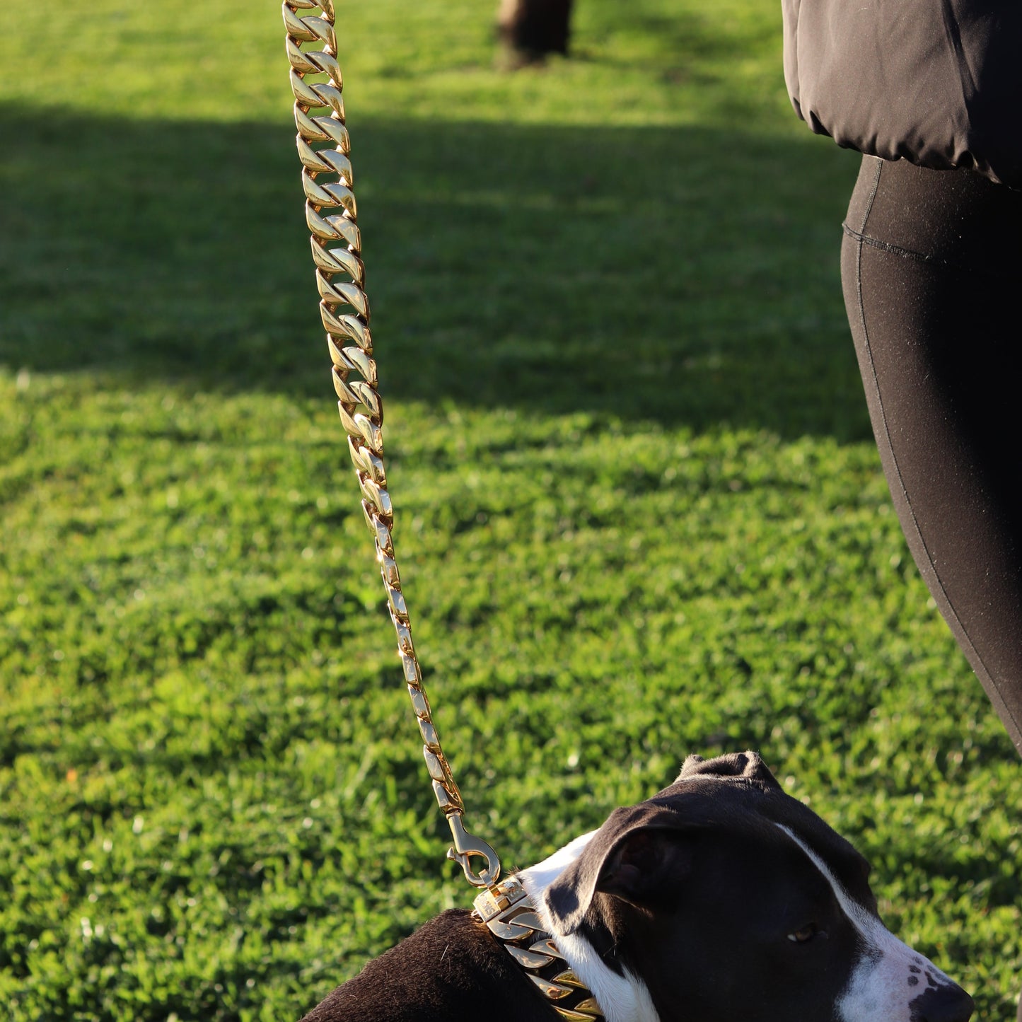 Command attention with our 32mm Gold Cuban Link Leash. Crafted from robust 316 stainless steel and plated in dazzling 18k gold, this leash combines strength with luxurious style. Perfect for dogs who deserve the very best. Buy now and elevate your walks to a whole new level of sophistication!