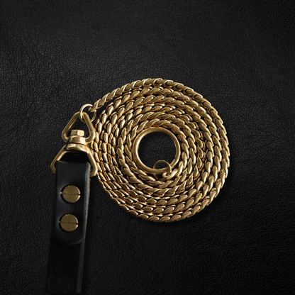 Elevate your dog's walks with our Gold Slip Lead featuring a stylish leather handle. Crafted from premium 316 stainless steel plated in radiant 18k gold, this lead combines durability with a touch of luxury. Perfect for effortless control and a sophisticated look. Buy now and redefine luxury for your pet!